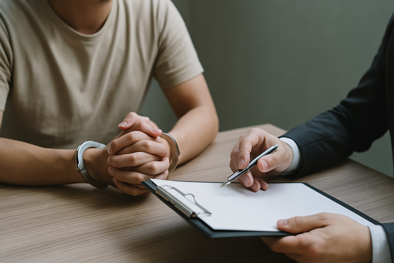 勾留中の男性が弁護士に相談をしている様子